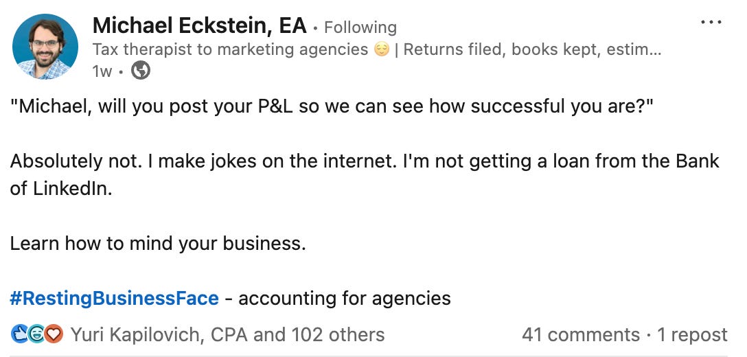 There is a stereotype of the accountant. Grey suit. Careful smile. Careful words. Eckstein does not fit it. He credits an unconventional apprenticeship. “I left college and worked for my dad. Most people went to big firms where they’re told, this is professionalism. I never knew better,” he says. He talks to clients like a person and posts like a person. It is deliberate and effective.