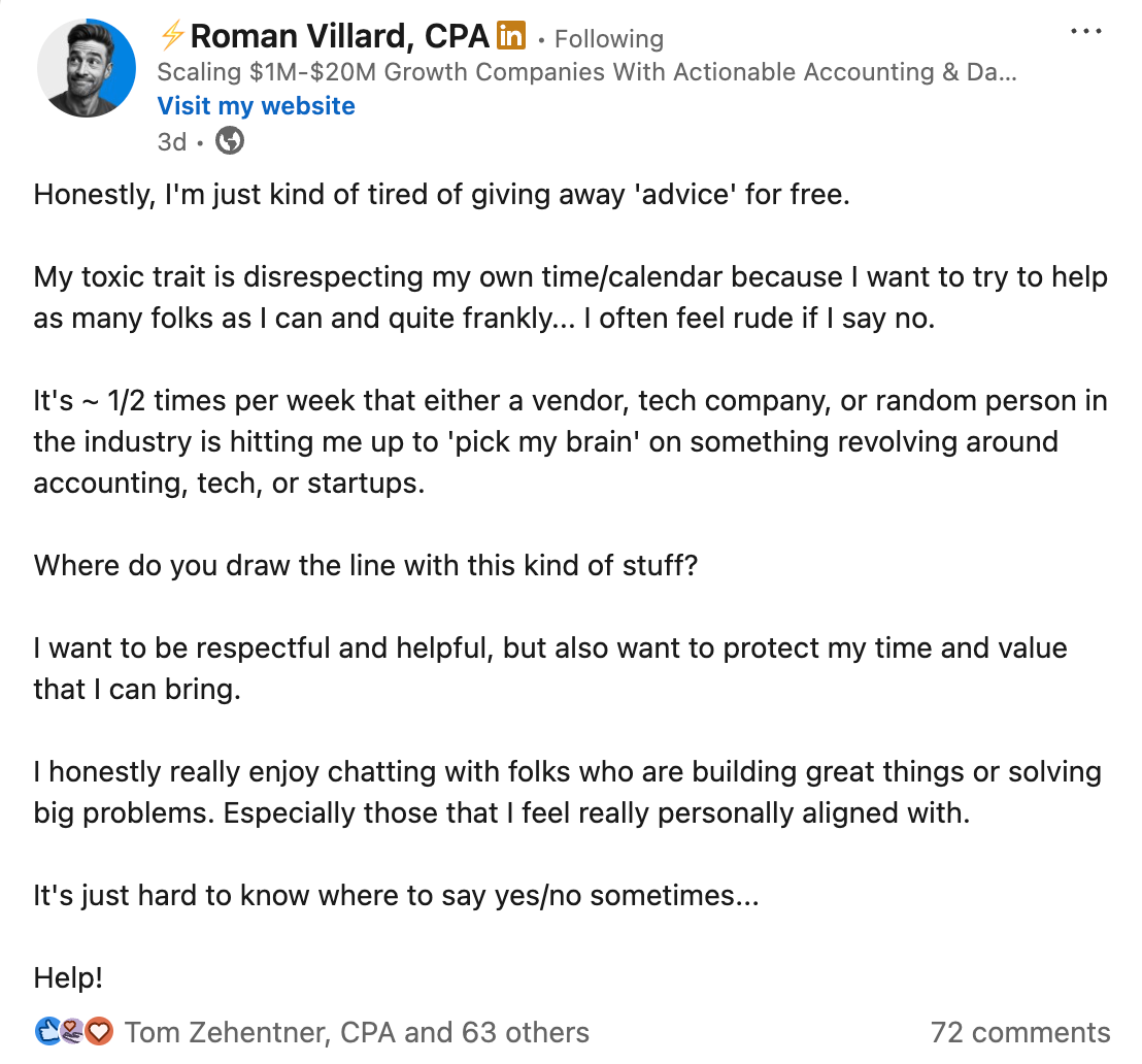 For example, Logan avoids diving into unfamiliar tax laws outside his area of practice. Why? Because learning those laws might take hours and he could better spend that time on other high-impact tasks. The same goes for services outside your core expertise. Just because a client asks doesn’t mean you have to say yes.